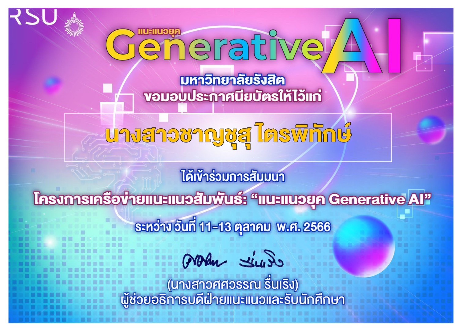 มิสชาญชุสุ ไตรพิทักษ์ ได้เข้าร่วมสัมมนา โครงการเครือข่ายแนะแนวสัมพันธ์ : “แนะแนวยุค Genarative AI” โดยภายในงาน ดร.อรรถวิท อุไรรัตน์ อธิการบดีมหาวิทยาลัยรังสิต ได้กล่าวถึงแนวทางการพัฒนามหาวิทยาลัยในปี 2567 จะดำเนินการด้วยวิสัยทัศน์ 4 ด้าน ได้แก่ ด้านแผนและพัฒนา ด้านวิจัย ด้านวิชาการ และด้านกิจการนักศึกษา เพื่อปรับให้มหาวิทยาลัยเป็นมากกว่า “สถาบันการศึกษา” โดยมุ่งเน้นการปรับหลักสูตรให้นักศึกษาได้เปลี่ยนสู่ยุค Genarative AI คือการเรียนรู้จากการปฏิบัติเพิ่มขึ้น สนับสนุนปัจจัยเสริมด้านนวัตกรรมและเทคโนโลยี ที่มีการเปลี่ยนแปลงตลอดเวลา โดยเชิญเครือข่ายครูแนะแนวโรงเรียนต่างๆ เข้าร่วมโครงการนี้ เพื่อเป็นการแลกเปลี่ยนความรู้เกี่ยวกับทิศทางการศึกษาในอนาคต พร้อมทั้งมีการบรรยายในหัวข้อ “แนะแนวด้วย ChatGPT and Genarative AI โดย ผศ.ดร.ธรรณพ อารีพรรค วิทยาลัยนวัตกรรมดิจิทัลเทคโนโลยี โดยเป็นการแนะนำรูปแบบโปรแกรม Chatbot ที่ใช้ทั่วโลกให้รู้จัก และกิจกรรมแนะแนว “ด้วยสัมผัสหัวใจของความเป็นมนุษย์” โดย ดร.วรชาติ เฉิดชมจันทร์ เป็นการทำกิจกรรมกลุ่มย่อยให้ทุกโรงเรียนระดมความคิด และนำเสนอพร้อมทั้งสรุปกิจกรรม Reflection in Action เลือกด้วยหัวใจ และการบรรยายเรื่อง “นวัตกรรมจากการแพทย์แผนตะวันออก : ทางเลือกอาชีพและโอกาสต่อยอดธุรกิจ” โดย อาจารย์ปานเทพ พัวพงษ์พันธ์ คณบดีวิทยาลัยการแพทย์แผนตะวันออก มหาวิทยาลัยรังสิต