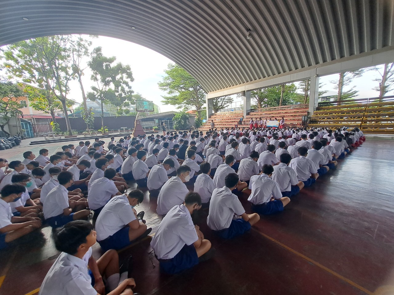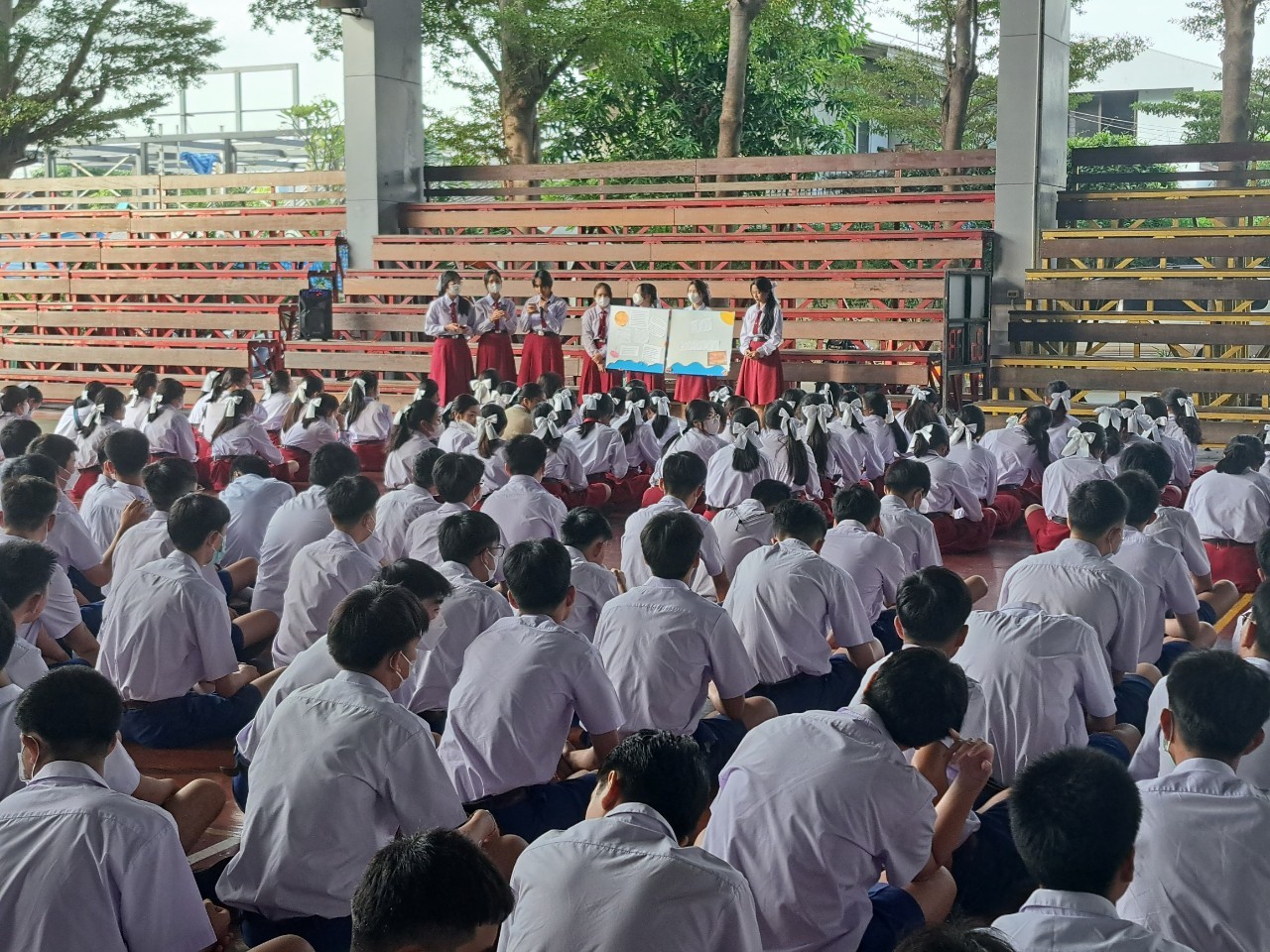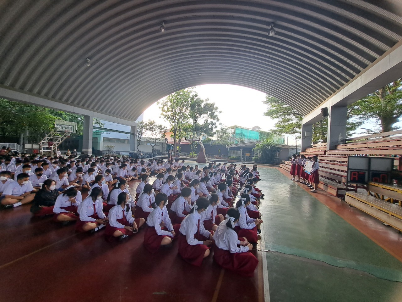 บรรยากาศการเข้าร่วมกิจกรรม Morning Assembly ของนักเรียนชั้นมัธยมศึกษาปีที่ 4 โดยนักเรียนได้รับความรู้เรื่อง ประเพณีลอยกระทง โดยตัวแทนนักเรียนจากระดับชั้นมัธยมศึกษาปีที่ 4/5