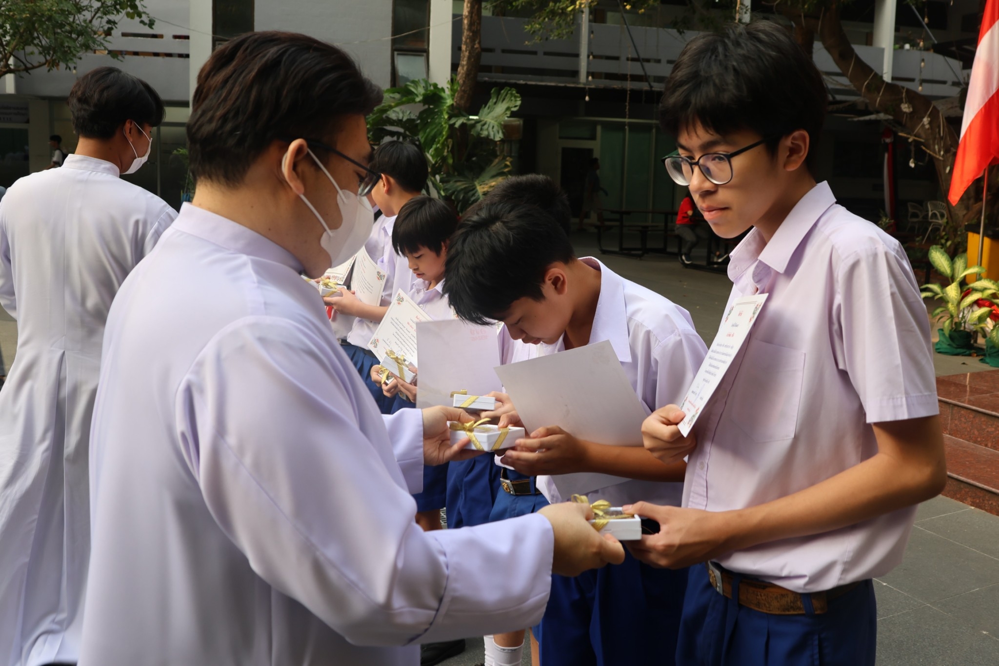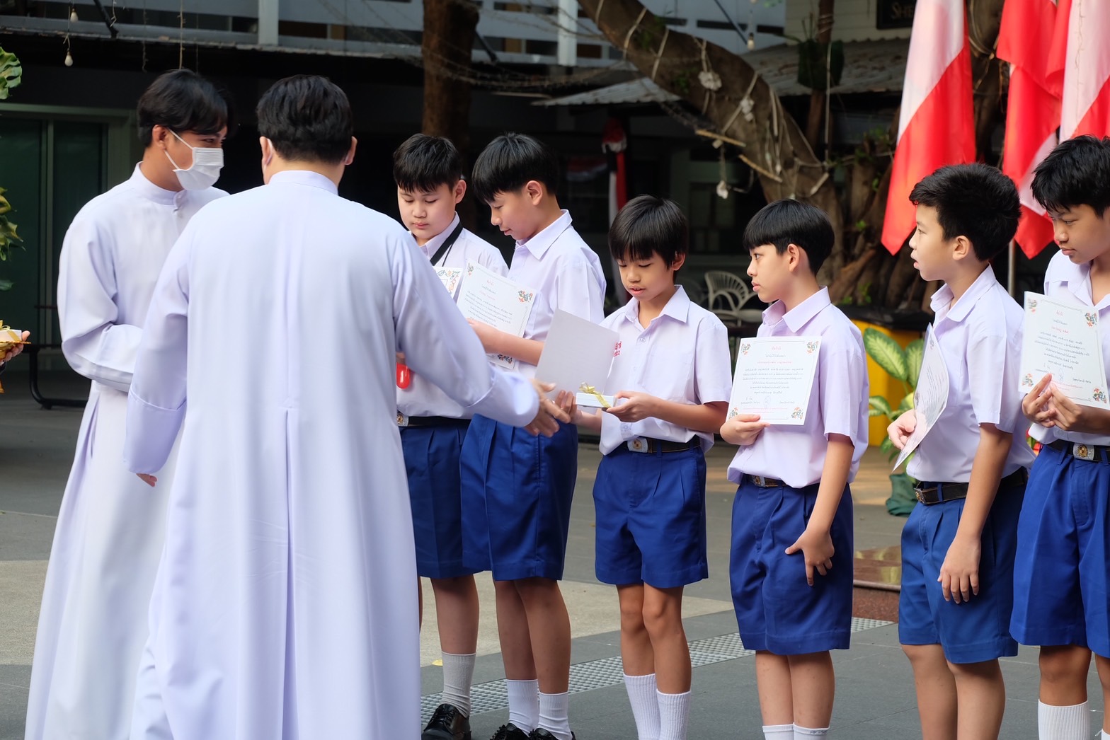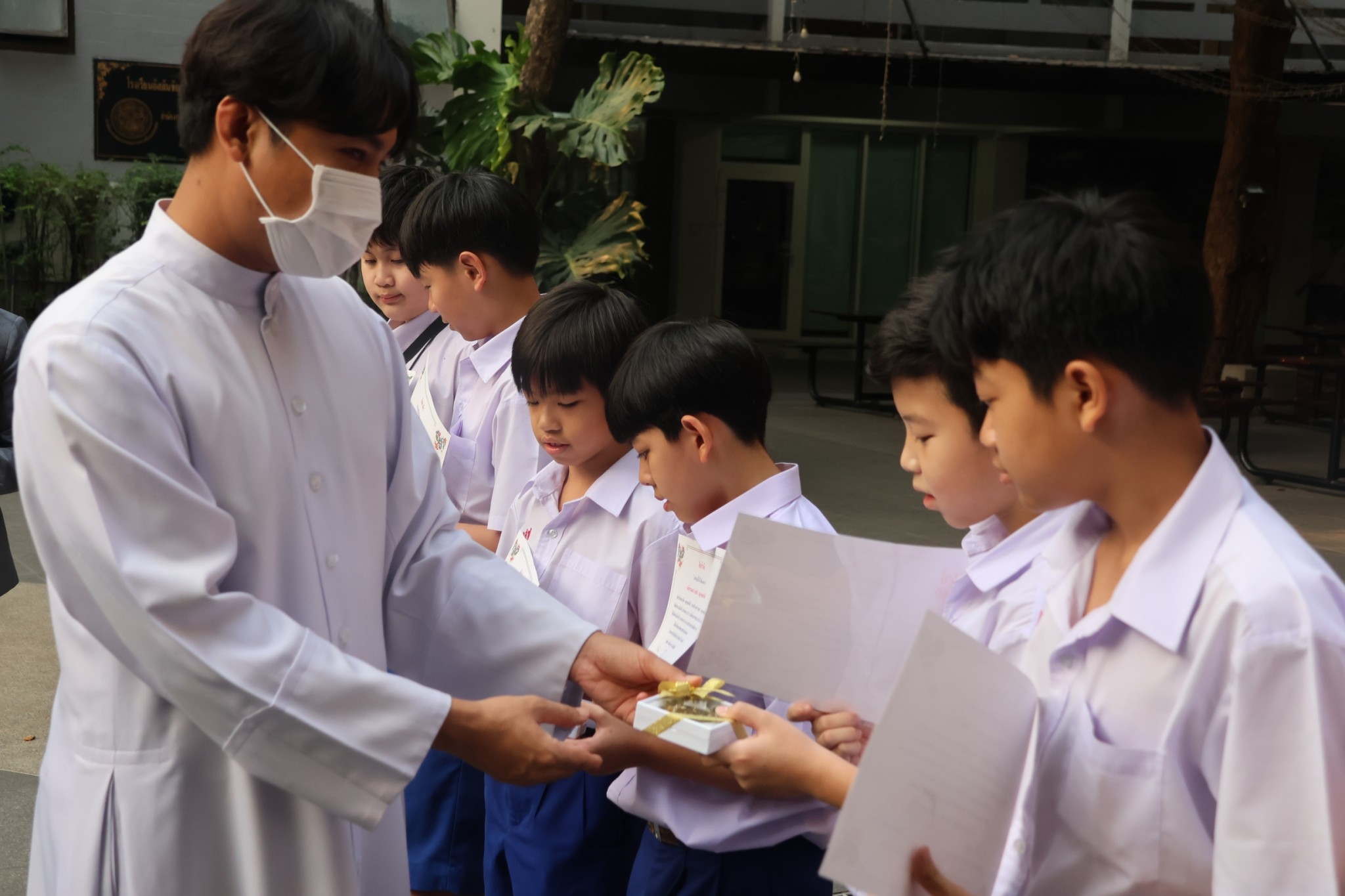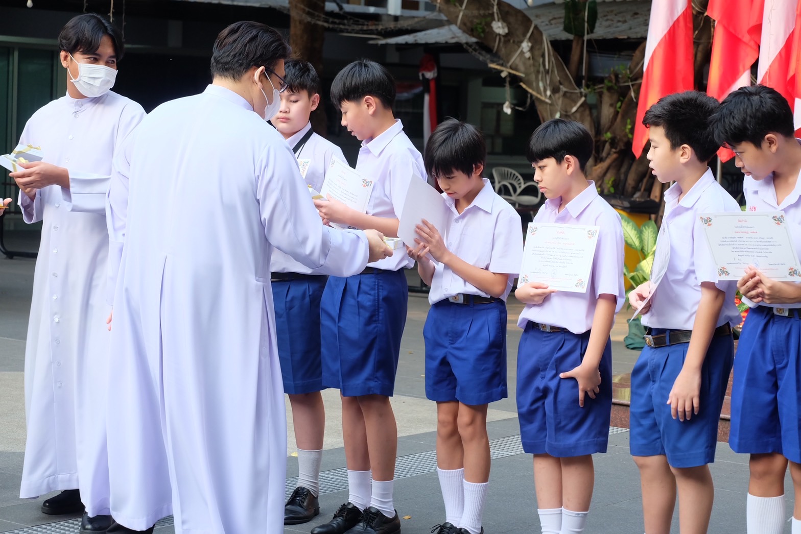 งานอภิบาล สำนักผู้อำนวยการ โรงเรียนอัสสัมชัญสมุทรปราการ ภราดามานิต สกนธวัฒน์ รองผู้อำนวยการ ภราดาณัฐธร สุพล รองผู้อำนวยการ มอบของที่ระลึกสายลูกประคำแสดงความยินดีและมอบเกียรติบัตรใบรับลองการรับศีลกำลังให้กับนักเรียนคาทอลิกระดับชั้นประถมศึกษาปีที่ 6 จำนวน 7 คน
