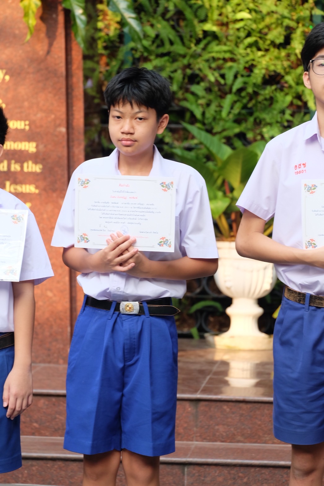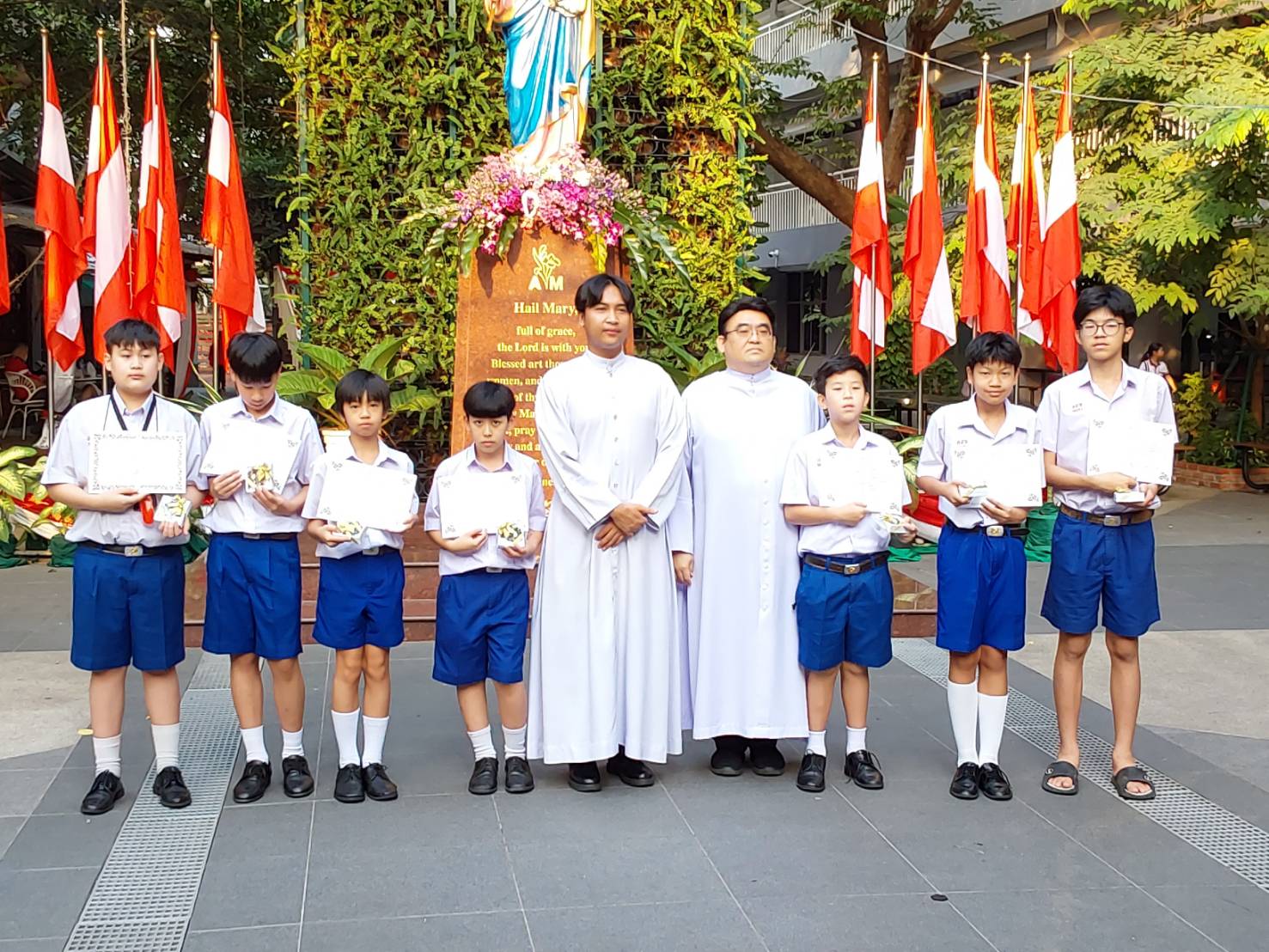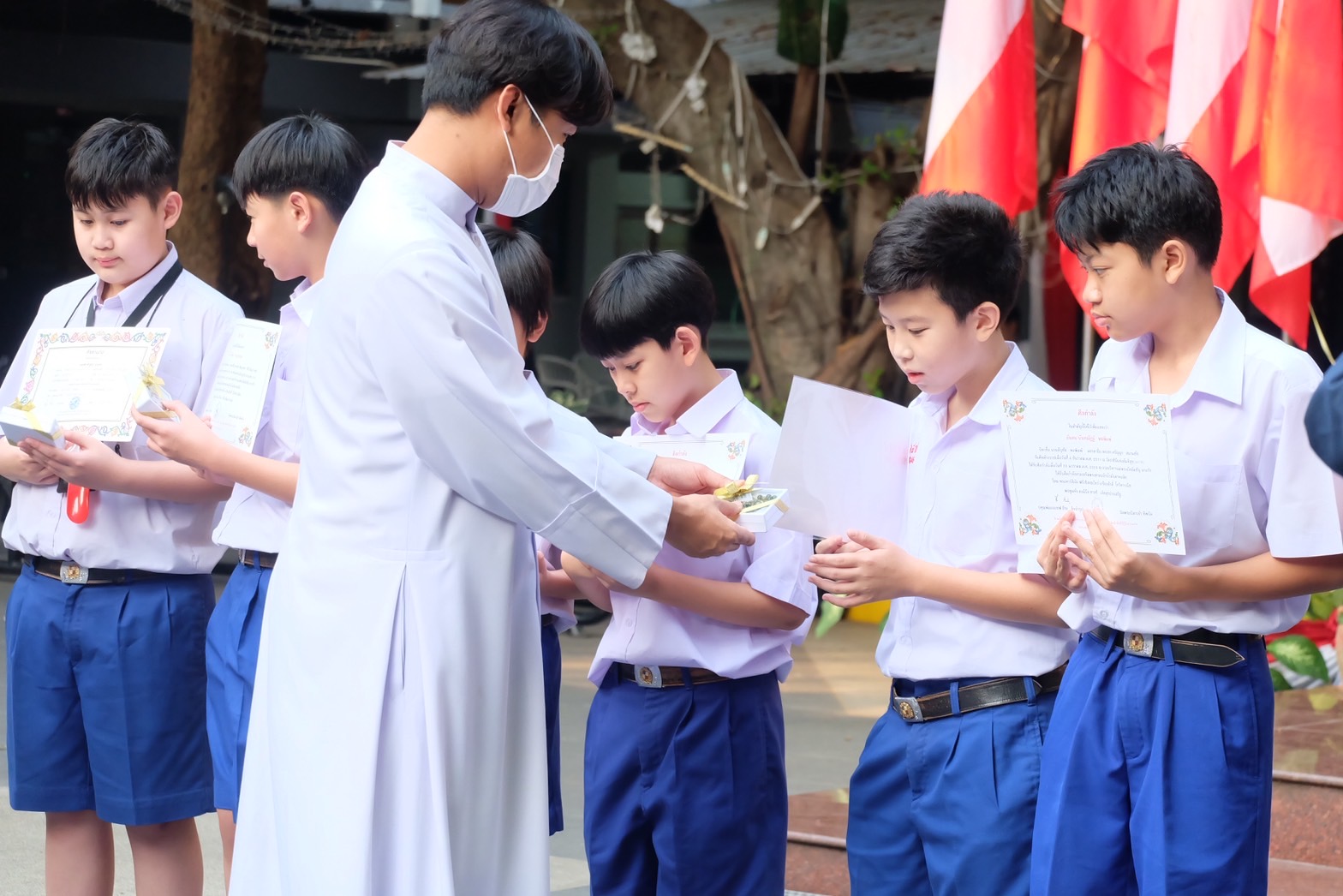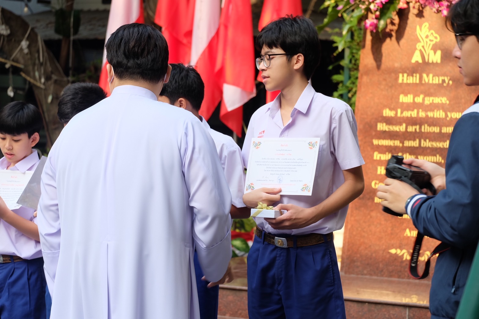 งานอภิบาล สำนักผู้อำนวยการ โรงเรียนอัสสัมชัญสมุทรปราการ ภราดามานิต สกนธวัฒน์ รองผู้อำนวยการ ภราดาณัฐธร สุพล รองผู้อำนวยการ มอบของที่ระลึกสายลูกประคำแสดงความยินดีและมอบเกียรติบัตรใบรับลองการรับศีลกำลังให้กับนักเรียนคาทอลิกระดับชั้นประถมศึกษาปีที่ 6 จำนวน 7 คน