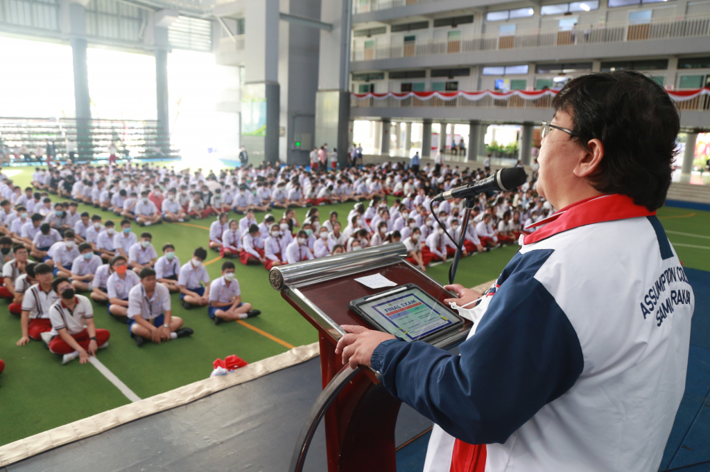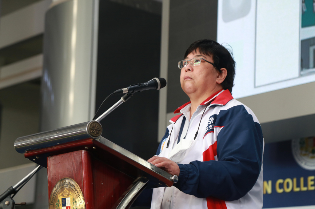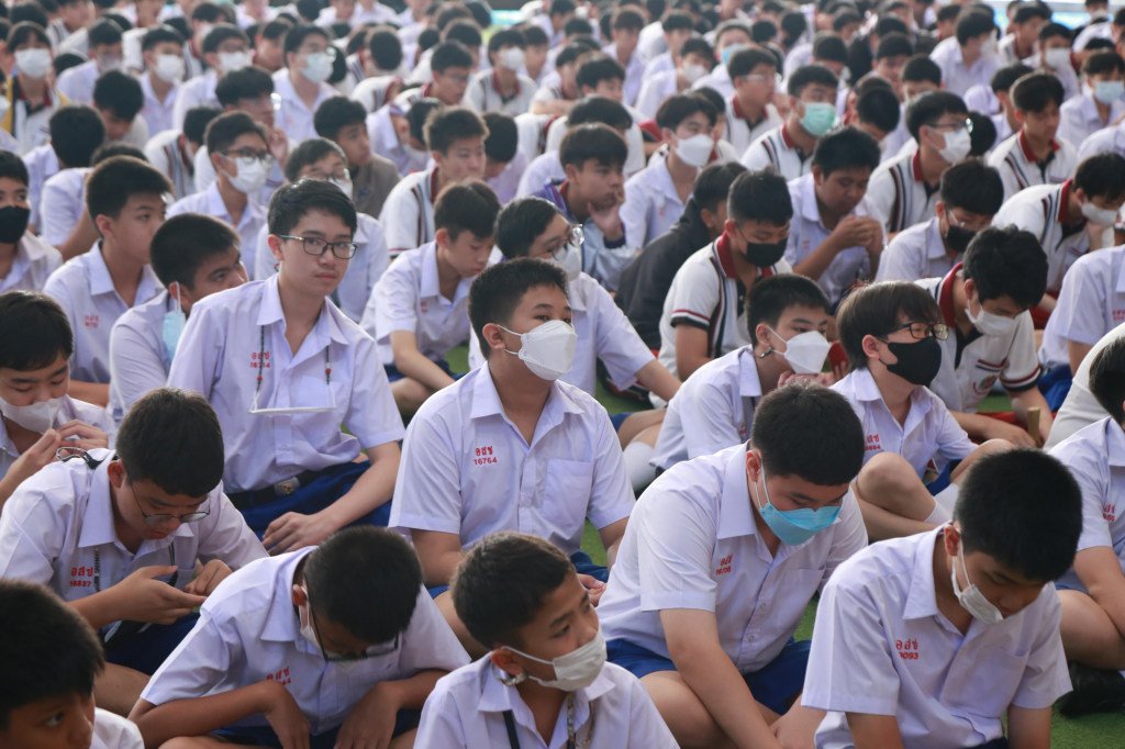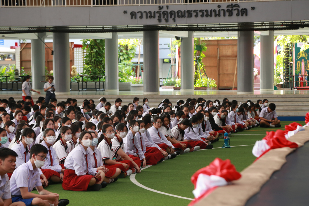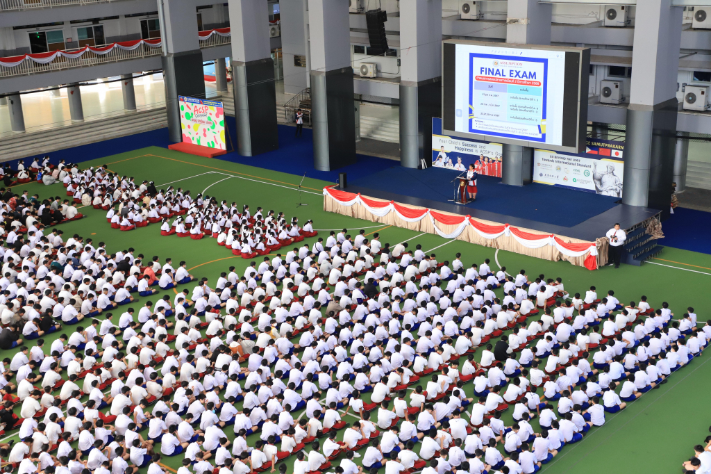 มิสรุ่งรัตน์ กมลศิริประเสริฐ หัวหน้าฝ่ายวิชาการ ประชุมนักเรียนระดับมัธยมศึกษา ภาคเรียนที่2/2566 ในวันอังคารที่ 20 กุมภาพันธ์ พ.ศ.2567 ณ บริเวณ Saint Louis Arena