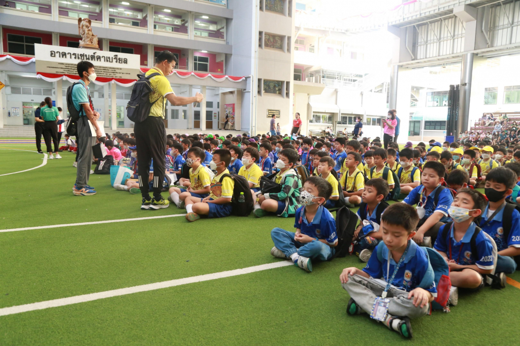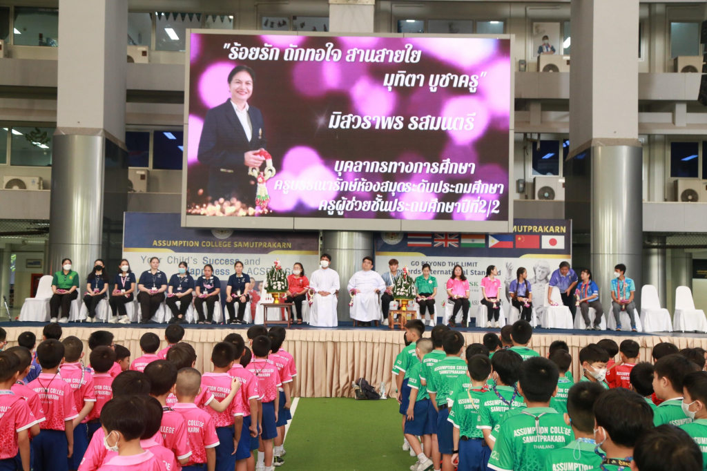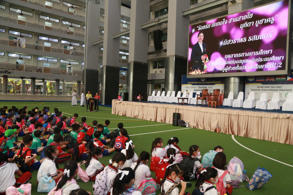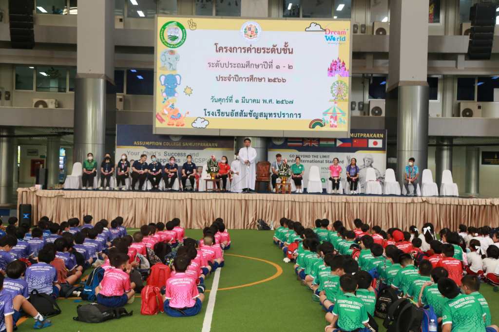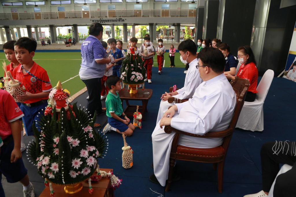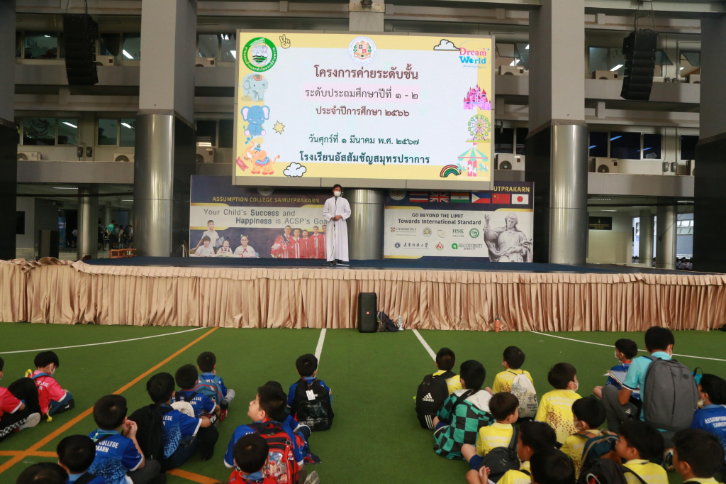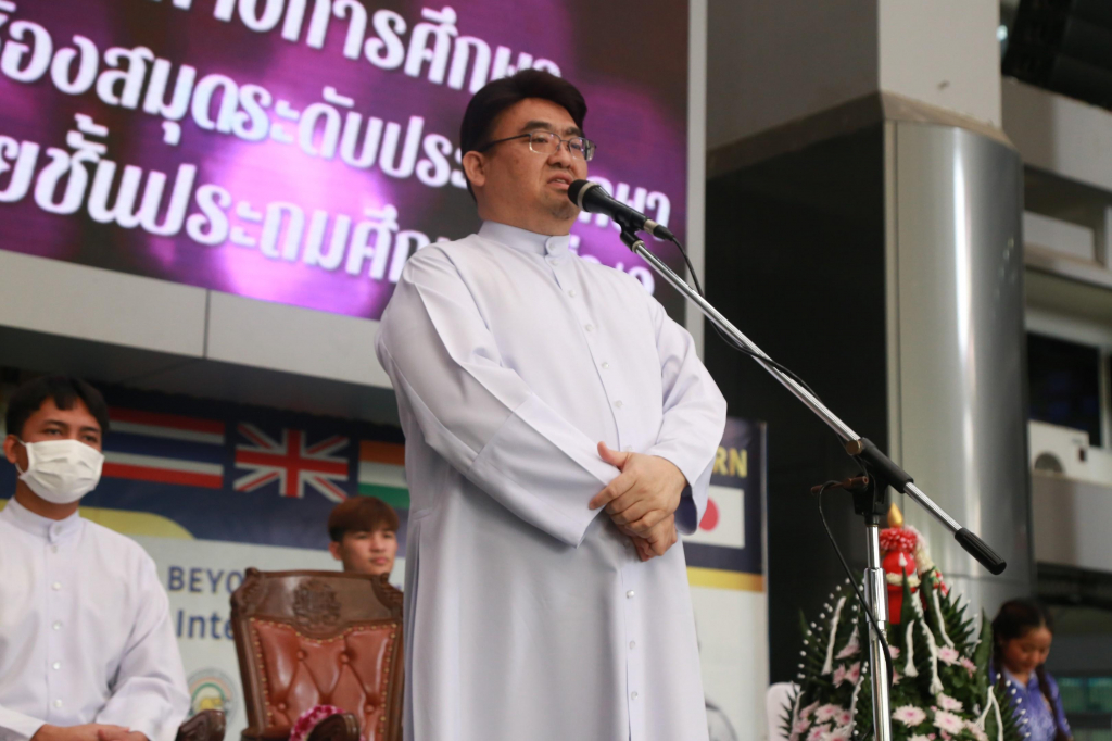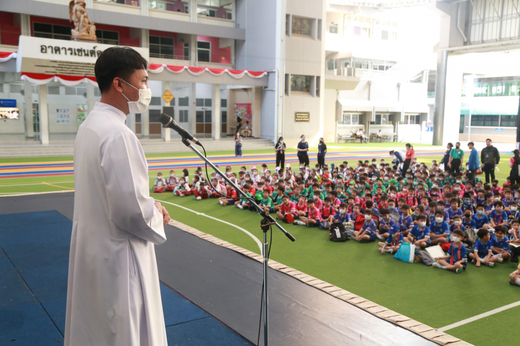 ภราดา มานิต สกนธวัฒน์ และภราดา ณัฐธร สุพล รองผู้อำนวยการ กล่าวให้โอวาทนักเรียนระดับชั้นประถมศึกษาปีที่ 1-2 กิจกรรมค่ายระดับชั้นและพิธี "ร้อยรัก ถักทอใจ สานสายใย มุทิตา บูชาครู" มิสวราพร รสมนตรี บุคลากรทางการศึกษา รักษ์ห้องสมุดระดับประถมศึกษา ครูผู้ช่วยชั้นประถมศึกษาปีที่ 2/2 ณ บริเวณ Saint Louis Arena